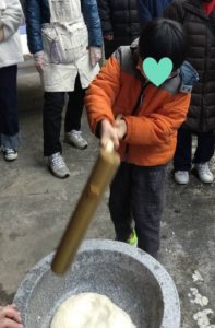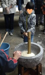 日本の年末年始の良き風習としての「お餅つき」。昔はどの家庭でも一般的に行われていた事を生徒や児童に話をして楽しみました。